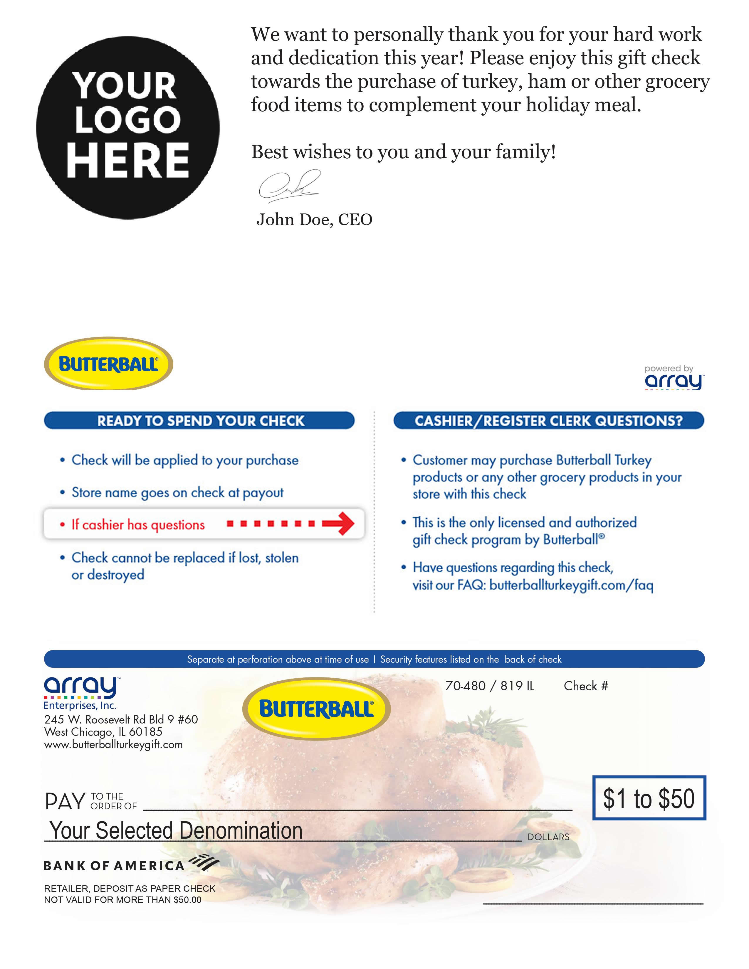 Companies large and small, across all industries, have been using the Butterball Turkey Gift Check Program for nearly 30 years for: